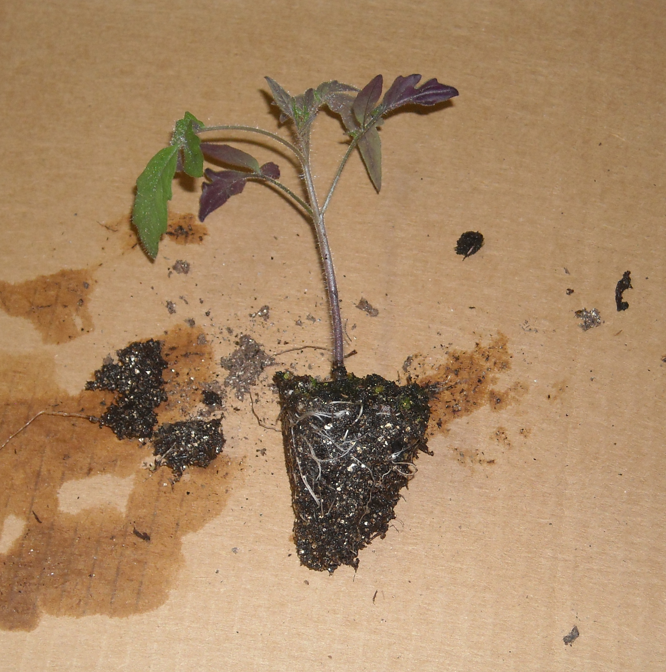 Once I remove the transplant from the seed starting cell I cut off the bottom leaves from the transplant. When I place the transplant in the new pot I make sure to bury the stem deeper then it previously was, to help encourage the development of a stronger root system. I only let the top leaves and a little of the stem stick above the mixture in the pot.