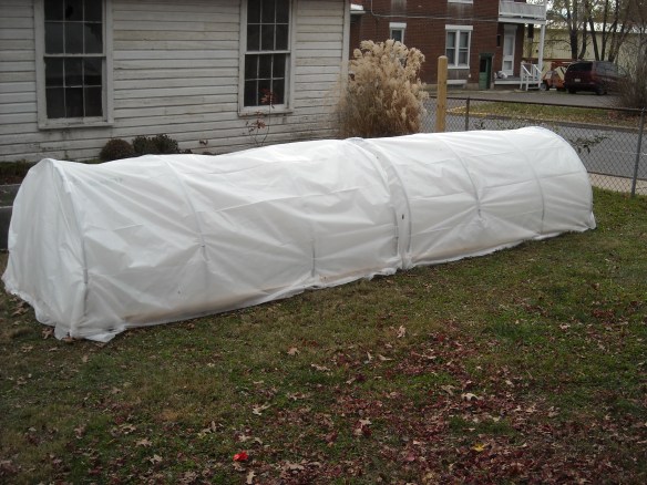 The weather report for this week was nightly lows in the 20’s F and day time highs in the upper 30’s F. As a result, last weekend I applied a layer of clear plastic over top of the row cover on the low tunnels. I used a basic construction grade 4 mil. thick clear plastic purchased at my local hardware store. I used the same thing last winter with good success.