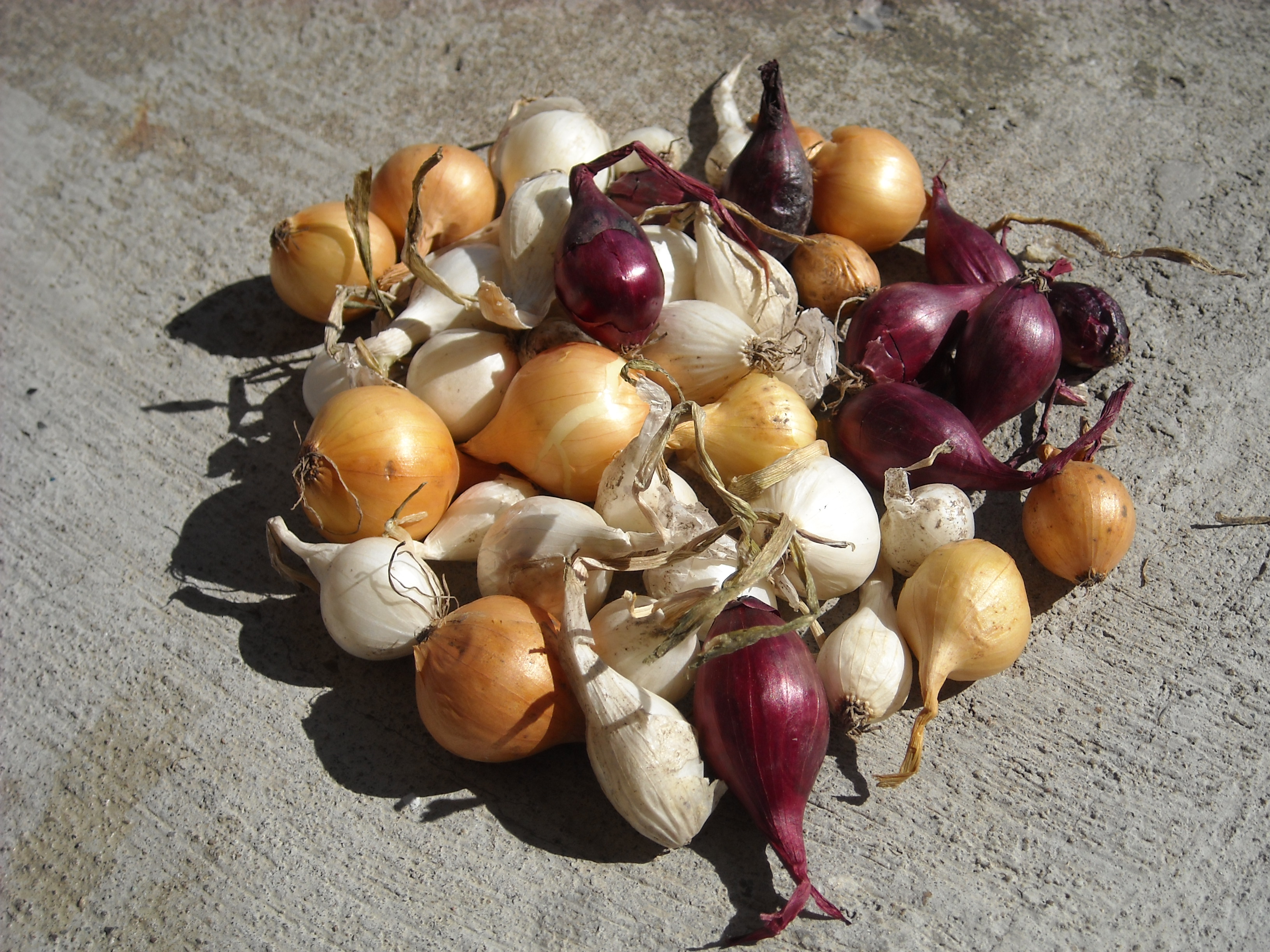 I always purchase my onion sets from our local hardware store, they have a great selection. Planting the onion sets is a pretty simple process. First I create mounds of dirt for each row then I work my way down each row pushing the onion set down until they are completely covered. I plant my onion sets pretty close together, then in the late spring I will pick a few of them for spring onions, I pick every other one or so to allow more space for plants that will grow into large onions.