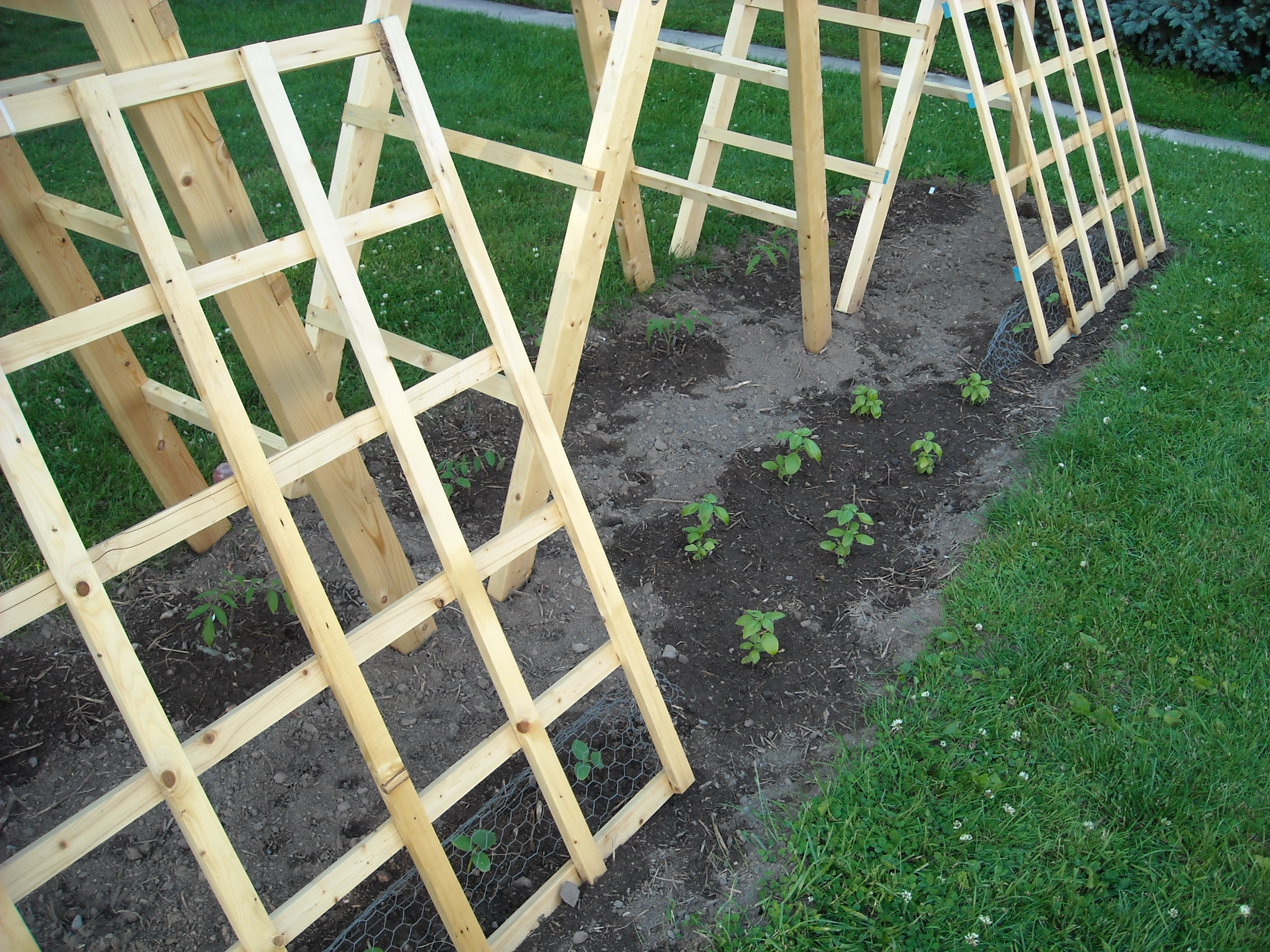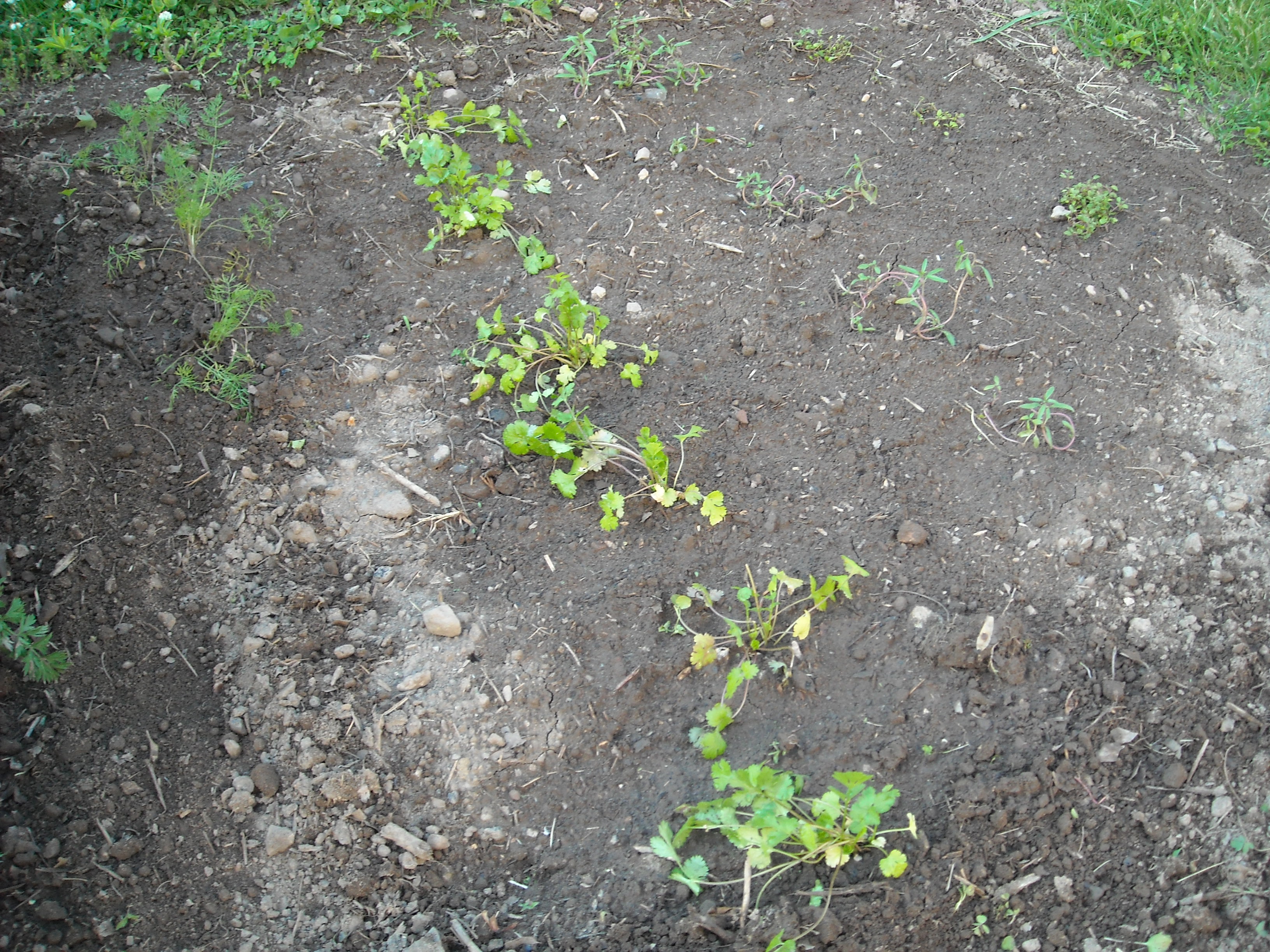 We used one of the wheel paths created by the rototiller to plant potatoes in. Each piece of potato is placed in the row with the eyes facing up. We spaced the potatoes about 24 inches apart down the row and spaced each row about 30 to 36 inches apart. This should give the potatoes adequate room to grow.